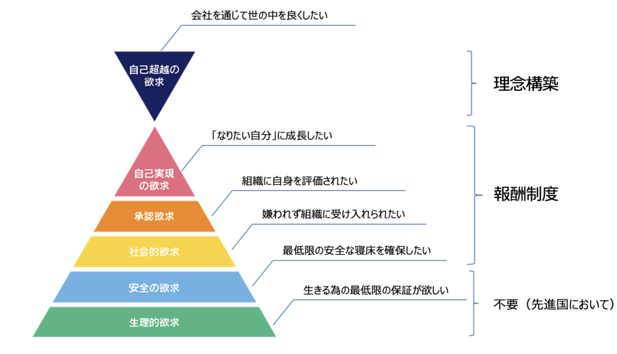 下の図をご覧ください。下の図はマズローという学者が説いた従業員のモチベーションを管理する考え方を示したものです。