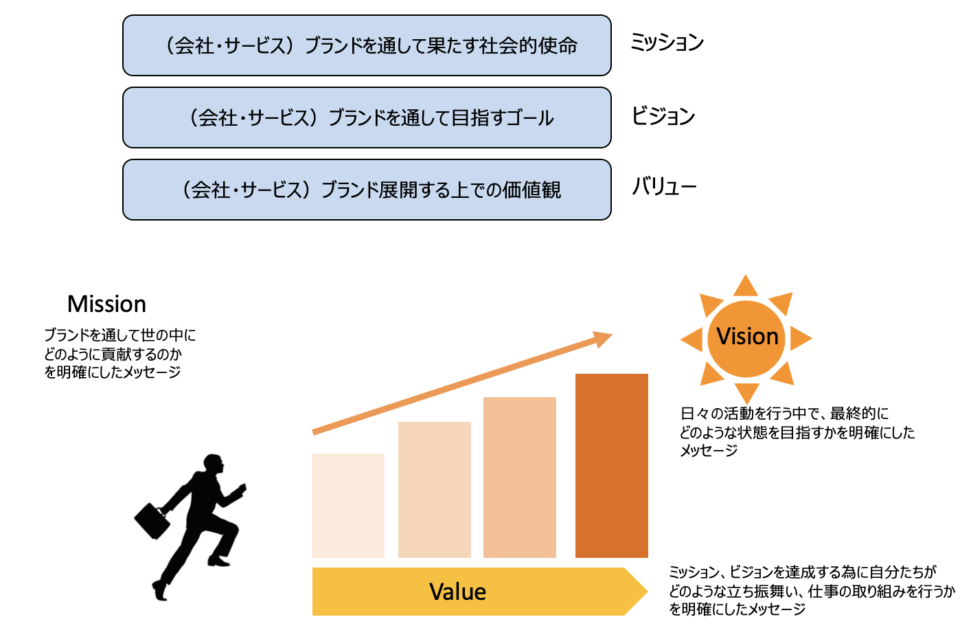 理念については、「ミッション」と言い換えられることもありますが、まずそのミッションを明確にし、それらを達成している状態を「ビジョン」として定義します。そして、「バリュー」という価値観をスタッフに根づかせることで、達成に向けて邁進するのです。これらが理念構築になります。