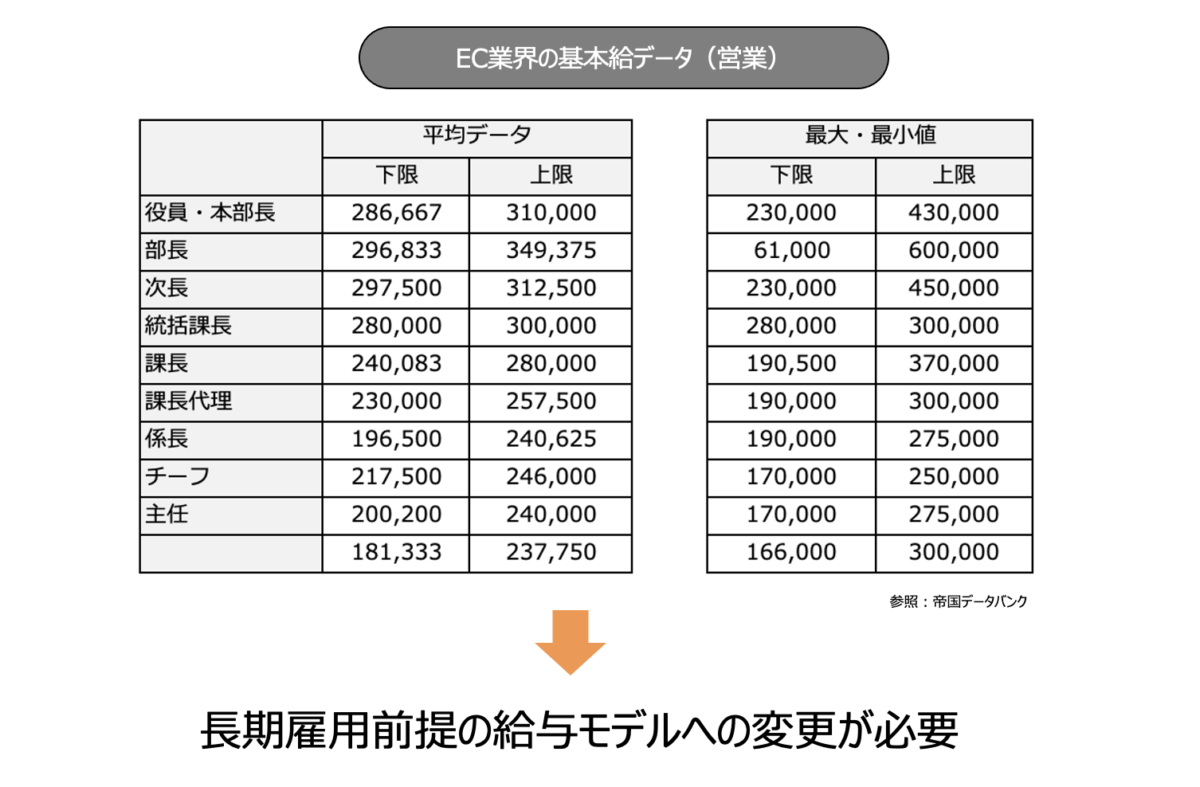 次の図は、EC業界における基本給のデータですが、このようなデータを踏まえながら、長期雇用を前提とした給与モデルを作っていきましょう。例えば、採用当初は下限の給与から始め、徐々に上限まで引き上げていくなどの考え方があります。