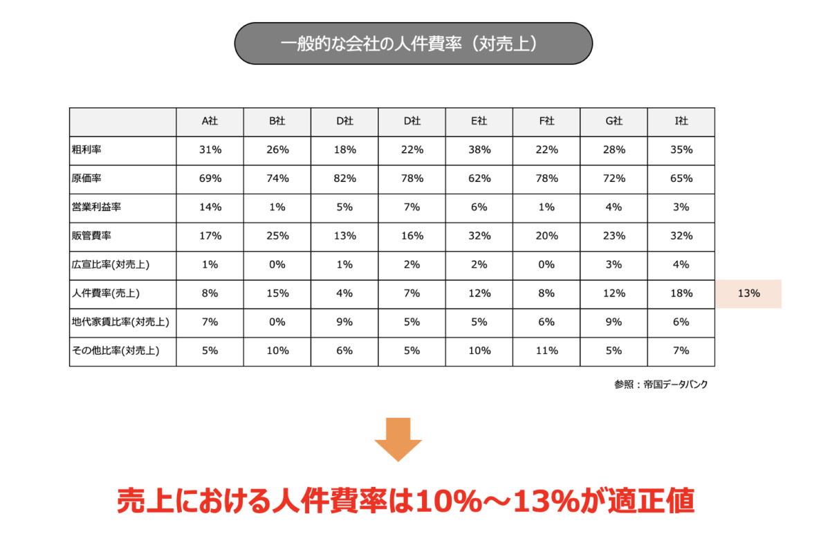 また、下の図は、一般的な会社の人件費率を示したものですが、売り上げにおける人件費率は10〜13%が適正ですので、その基準をベースに給与を作っていく必要があります。