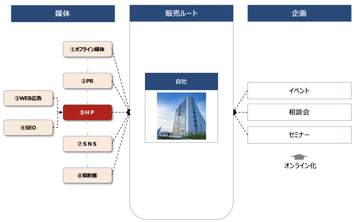 媒体・販売ルート・企画があり、媒体においてはオフライン・SNS・紹介等の施策があります。その中で、Web広告・SEOを活用したホームページ媒体は非常に重要です。さらに、次の図をご覧ください。