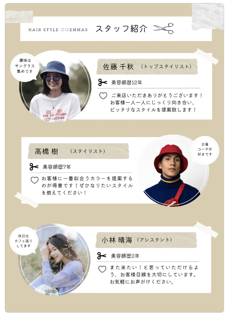 次は、スタッフの魅力的な表示についての事例です。下の図は、スタッフを紹介するページで自己紹介分を丁寧に記載し、顔写真もしっかりと掲載している好例になります。
